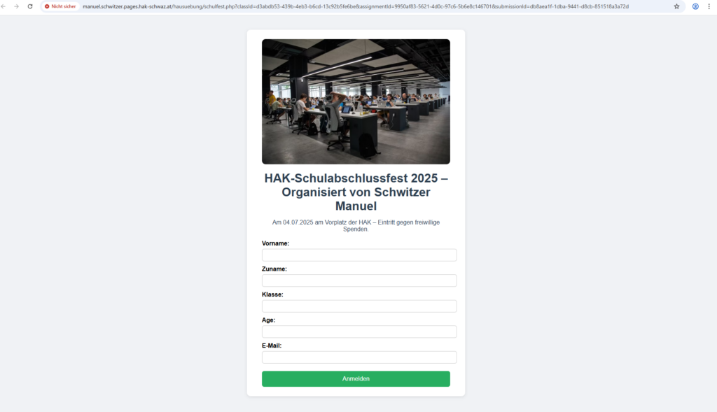 Ich habe ein vollständiges Webformular mit PHP programmiert, das eine Anmeldung zum HAK-Schulabschlussfest am 04.07.2025 ermöglicht. Die Teilnehmerdaten (Name, Klasse, Alter, E-Mail) werden dabei direkt in eine MySQL-Datenbank gespeichert. Zusätzlich wird eine Teilnehmerliste angezeigt.